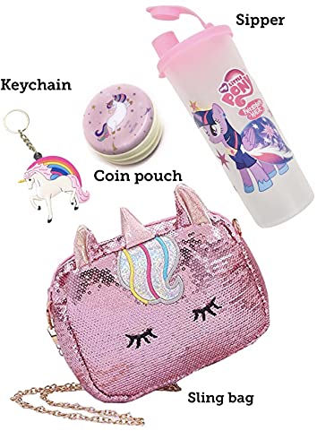 ledelite brand assures you on quality and on time delivery ..this package includes 1 unicorn sling bag + 1 cartoon sipper + 1 cartoon coin pouch round hardcase